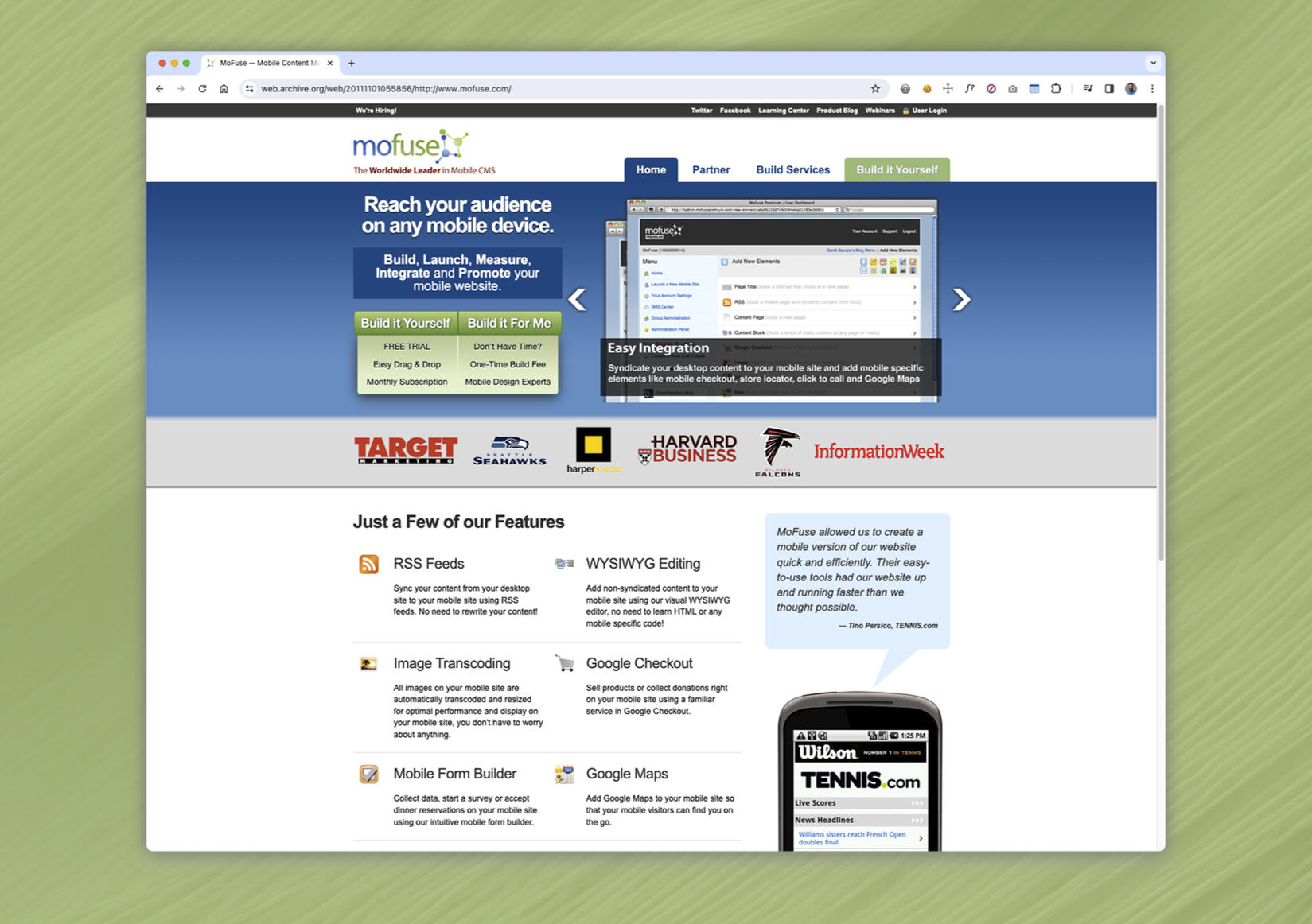 The MoFuse platform launched at the dawn of the iPhone era in 2007 and allowed anyone to quickly create a mobile app in just minutes using an intuitive drag-and-drop builder.